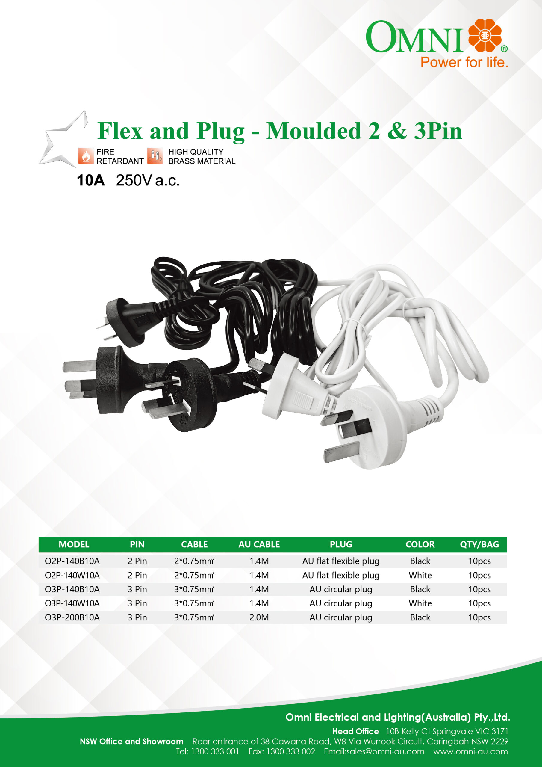 | O2P-140B10A | 2 Pin Flat Flexible Plug | Black | 1.4m | 10 pcs/bag 100pcs /ctn |